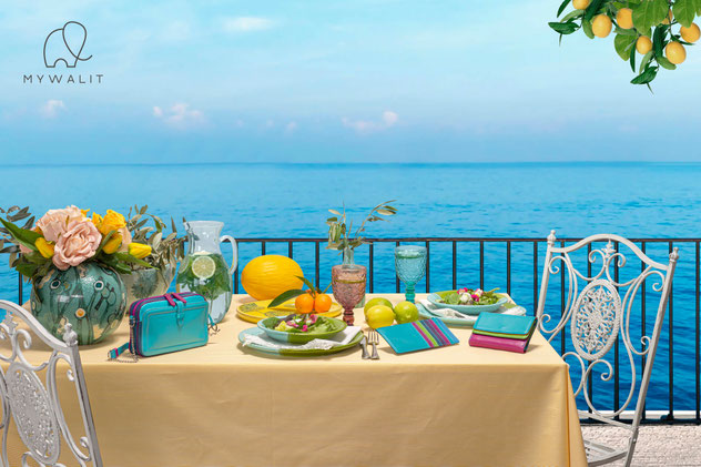 Das die Mauern bedeckende grüne Blattwerk wird durchbrochen durch die brillanten Purpur- und Pinktöne der Bougainvillaea in Nuancen, die wir in „Wild Berry“ und „Fuchsia“ wiederfinden.